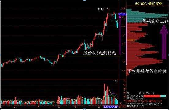 如图(二)所示,为晋亿实业的股价从8元到15元拉升后的筹码表现。可以看到:筹码从下方8元的集中处开始不断上移分散,但8元处的低位筹码仍大量存在。这也就意味着,在股价从8元向15元的拉升过程中,主力并未打算完全出货的意思。