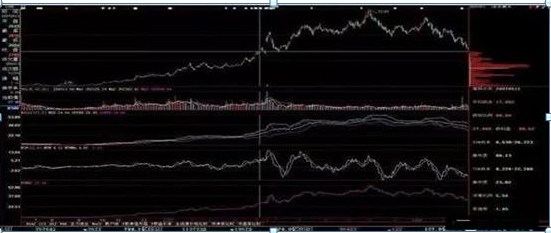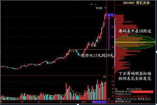 如图(三)所示,晋亿实业从第一波拉升的高点15元向29元迈进的过程中,最原始的8元成本处筹码不断向上移动。至29元时,筹码大体集中在18元附近。可以看到:虽然筹码整体都在上移,但是下方8元处的筹码仍未完成派发完,这表明主力需要再进行最后的收尾工作,使其完全脱身。
