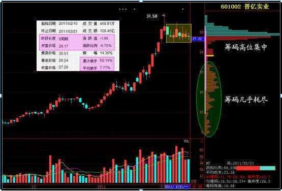 如图(四)所示,为晋亿实业在本轮行情的收尾阶段。在股价持续8天的横盘的过程中,累计换手率达62%,也就是常说的高位高换手。我们知道:一般个股在单日换手率在3%以下。所以在单日平均换手高达近8%的情况下,属于典型的异动行为。而对于图(三),在短短的8个交易日内,不仅下方8元的原始筹码几乎耗尽,就连在拉升中18元附近的筹码也完全转移,最终集中在28元的高位处。最终,主力成功将8元的低位筹码,全部派发给了28元高位站岗的散户。