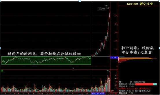 其实,主力吸筹的过程就是一个筹码转换的过程。在这个过程中,主力为买方,散户为卖方。只有低位充分完成了吸筹,主力才会形成拉升,从而结束吸筹阶段。而对应在筹码分布图中,则以筹码高度集中体现出来。如图(一)中所示,为晋亿实业(601002)前期的吸筹工作,时长近两年,筹码集中收集区域在8元左右。这个区域,也就是主力吸筹的大体成本。