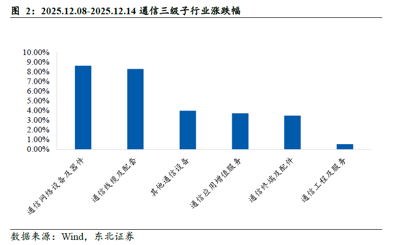 本周(2025.12.08-2025.12.14)通信三级子行业中,通信网络设备及器件涨幅最高 (8.62%),通信线缆及配套(8.28%)、其他通信设备(3.97%)、通信应用增值服务(3.71%)、通信终端及配件(3.46%)、通信工程及服务(0.52%)涨幅也较为明显,主要由国内外算力基础设施建设驱动。
