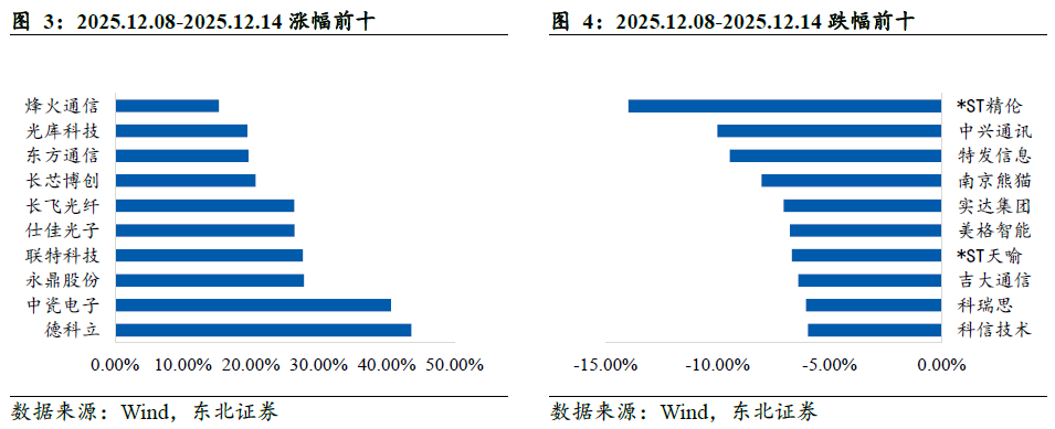 本周(2025.12.08-2025.12.14)德科立(43.66%)、中瓷电子(40.65%)、永鼎股份(27.80%)涨幅分列前三,*ST精伦(-13.99%)、中兴通讯(-10.01%)、特发信息(-9.46%)跌幅分列前三。