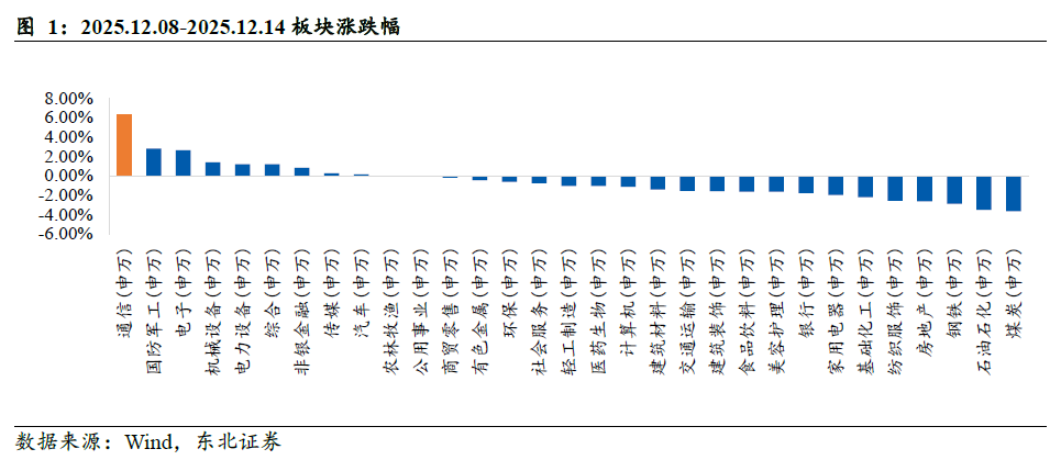 本周(2025.12.08-2025.12.14)申万通信指数上涨6.27%,上证指数下跌0.34%,深证成指上涨0.84%,创业板指数上涨2.74%,沪深300指数下跌0.08%,通信板块在31个申万一级行业中涨幅排名第一,显著跑赢大盘。