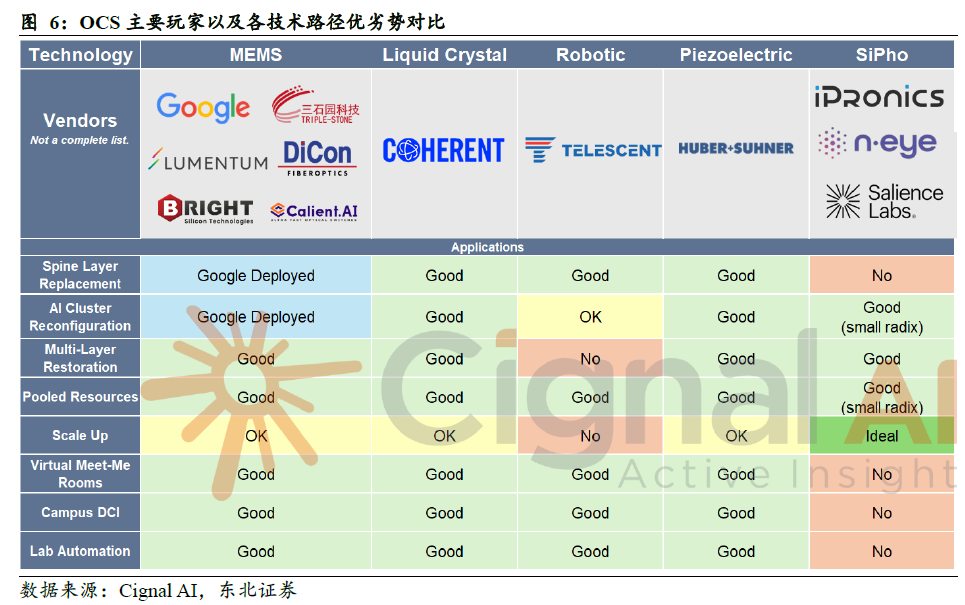 最新报告指出,数据中心内的OCS应用场景已远远超出谷歌最初的应用范围。运营商正在实施和评估OCS,用于纵向扩展(Scale-up)网络和后端网络、资源池化与解耦,以及园区数据中心互联,其中可靠性已成为AI级部署的决定性要求。多种技术方案——如MEMS(微机电系统)、液晶、压电、机器人和硅光子技术——均旨在满足不同端口数、速度和损耗要求的组合。