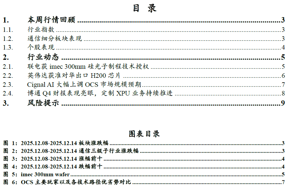 投资建议:我们看到光连接正在向“柜外有保障,柜内有增量”的乐观预期去演绎,持续看好头部光模块厂商在CPO和硅光领域的布局,建议关注硅光代工厂产能进展;对于OCS,我们认为本轮行情的持久度侧面反映国内厂商参与度的提升,展望26年,OCS有望成为仅次于光模块的通信行业第二主线。