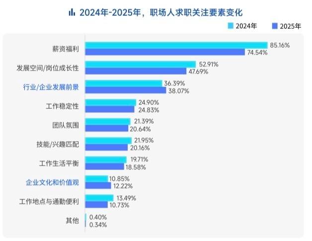 随着招聘市场回暖,职场人的求稳心态出现松动。职场状态“没有变化”的人才占比从2023年的45.30%下降到2024年的41.41%,2025年进一步下降至40.51%,“主动辞职”的人才占比显著上升,达到21.13%,较2023年提升8个百分点,较2024年提升2个百分点。在择业因素方面,求职者对于薪资福利的关注度出现下降,从去年的85%降至74%,对于行业前景、企业文化与价值观的关注度均有小幅上升。