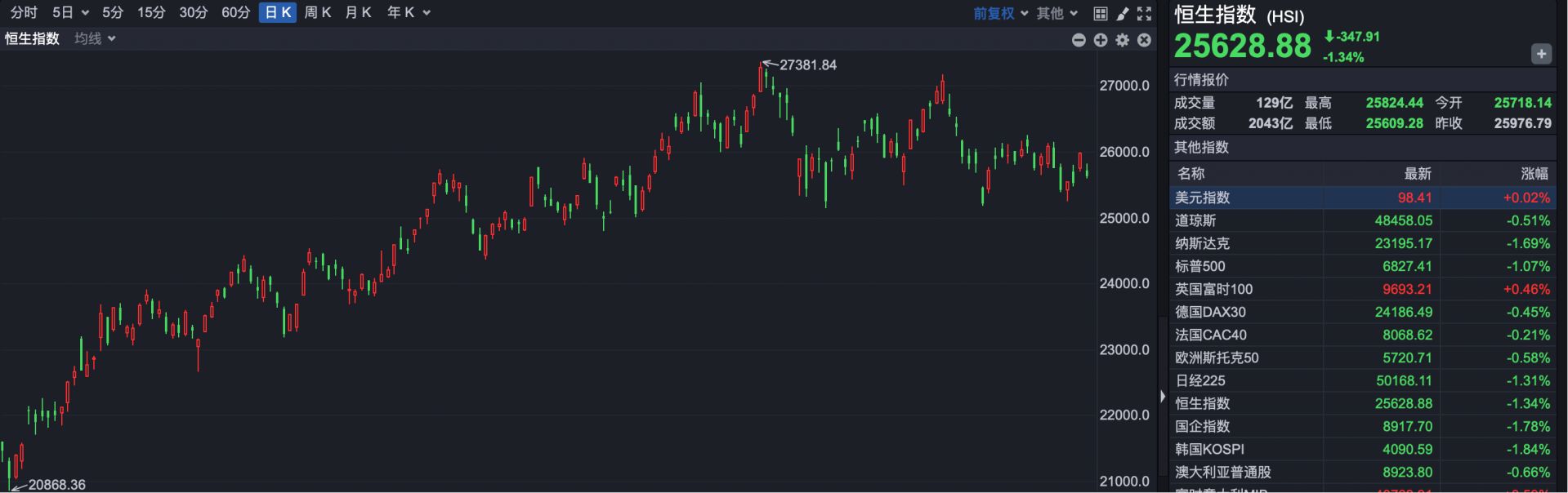 截至收盘,恒生指数报收于25628.88点,下跌347.91点,跌幅1.34%。