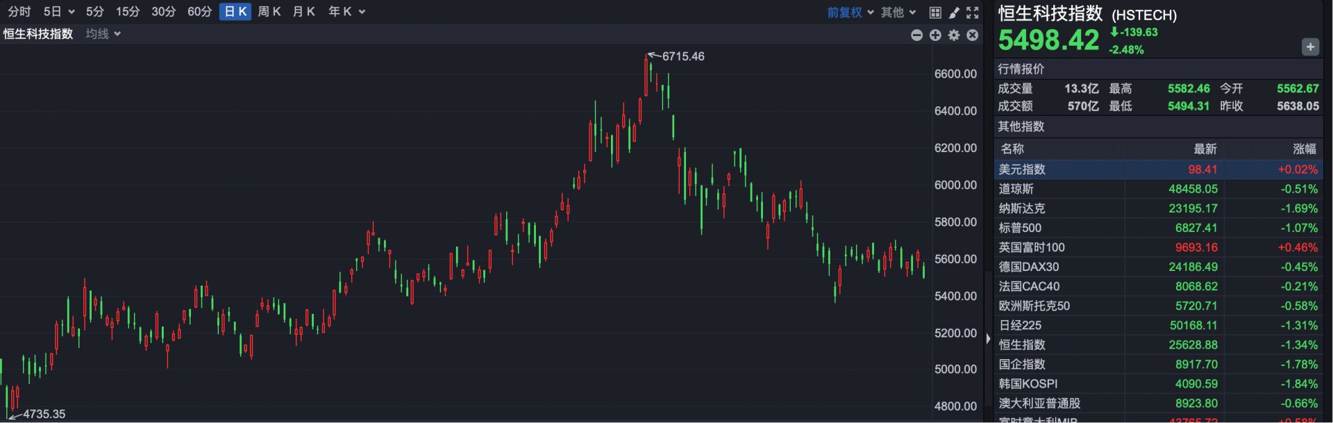 恒生科技指数收报5498.42点,下跌139.63点,跌幅2.48%。