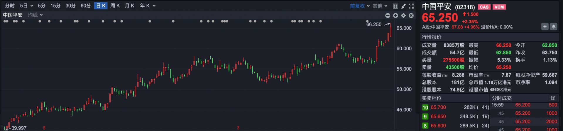 分析指出,保险股维持强势,主要还是受益于低利率时代分红险畅销等负债驱动,以及资产端大幅提升权益仓位收益可观,同时还有稳定分红,目前股息率还在4%以上,属于攻守兼备的品种。此前,大摩将中国平安列入重点推荐名单并上调目标价(A股上调至85元/股,H股上调至89港元/股),认为中国平安可把握财富管理、医疗健康及养老服务三大核心机遇,且市场担忧影响估值的因素正在消退。