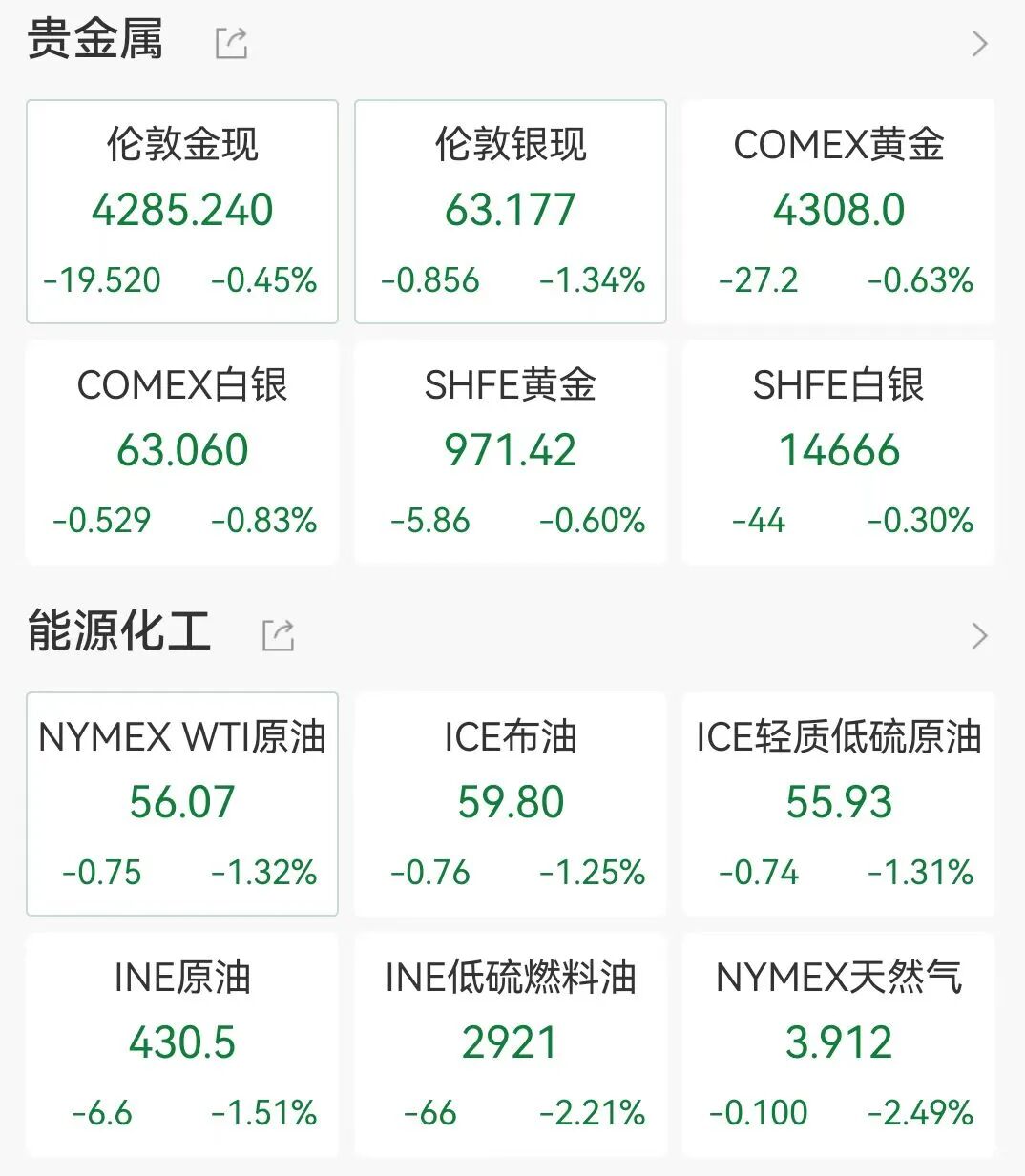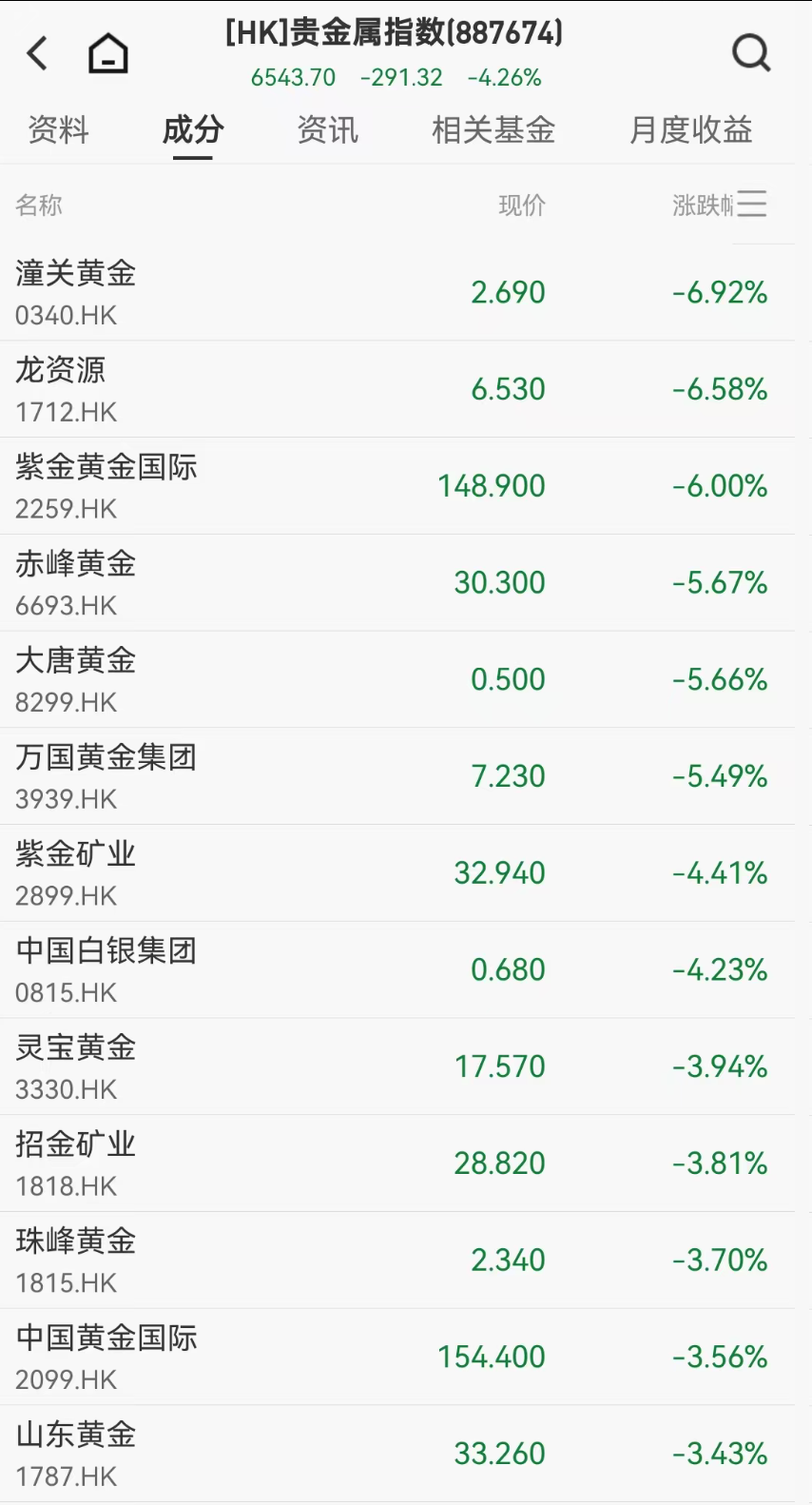 黄金股也全线调整,潼关黄金跌6.92%,紫金黄金国际跌6%,赤峰黄金跌超5%,珠峰黄金跌超3%,紫金矿业跌4.41%。