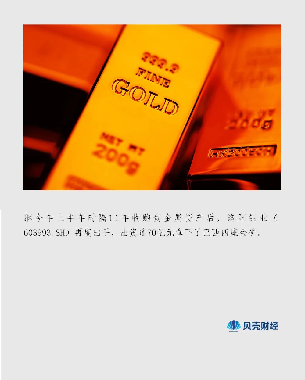 继今年上半年时隔11年收购贵金属资产后,洛阳钼业(603993.SH)再度出手,出资逾70亿元拿下了巴西四座金矿。