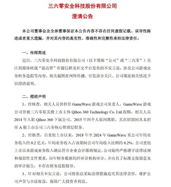 随后,360于12月16日晚于上交所发布澄清公告称,经核查,自重组上市以来,2018年至2024年GameWave系公司年均业务收入约0.2亿元,年均业务收入占该期间公司年均收入比例约 0.2%。公司重组上市以来游戏业务收入确认符合企业会计准则规定。公司始终严格遵守法律法规和规范性文件要求,历年财务数据均经审计机构审计,并出具了标准无保留意见的审计报告,不存在财务造假情形。