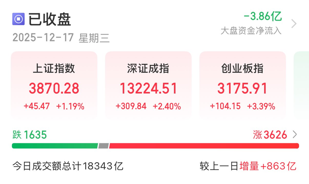 截至收盘,上证指数涨1.19%,深证成指涨2.4%,创业板指涨3.39%,北证50跌0.04%。全市场成交额18140亿元,较上日成交额放量659亿元。