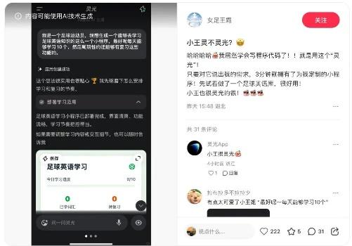 体育圈也迅速拥抱这一“黑科技”。女足球员王霜在社交平台晒出自己用灵光制作的英语学习小应用,并赞叹“比我上一场进球还快!”足球解说员刘建宏则在中超最后一轮开赛前,利用灵光成功预测了上海海港夺冠。前国脚李毅甚至用灵光细致解析了其标志性的“蚌埠回旋”,让球迷能更直观地理解这一足球技术。
