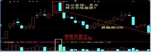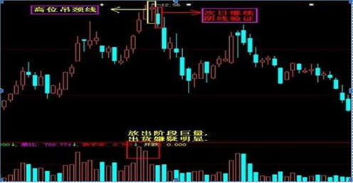 下图是该股的K线组合图,图上显示该股形成了一个高位吊颈线,那么此刻成交量已经连续放大到阶段巨量,我们判断有出货嫌疑,那么按照技术法则,对下一交易日佐证,下一交易日果然是一个影线,成交量并没有极剧萎缩,那么出货判断基本成立,虽然后面有反弹,但是该股还是不如了下降通道,后面跌幅高达30%。