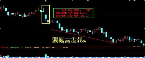 下图是三只乌鸦的杀伤力表现图,中途虽有高送转,但复权之后仍有一个跳空缺口,缺口加三只乌鸦杀伤力极大,随后在一个多月的时间内该股股价重创40%,这样的杀跌动力谁承受的起?因此当多种看跌技术共振的时候一定要注意,这样的伤害力是极为强劲的,要主力及时止盈出局,落袋为安。
