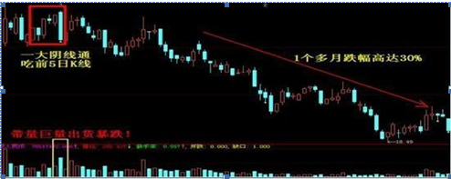 下图的K线图,当天的大阴线吃掉了前面5天k线,这是非常极端的杀跌信号,同时成交量放大,出货非常明显,有题材,有概念又怎么样,遇到大环境不好,技术面照样杀跌,该股在随后的2个月时间内暴跌30%,这是相当严峻的做空实战。