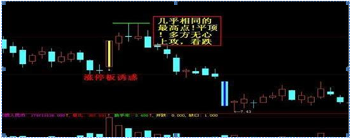 下图的K线,两天的最高价几乎一致,后一天未能超越前一天,就要警惕,不要抱有幻想,立即撤退,多方要上攻必定会突破,该涨不涨,必跌无疑,虽然有个涨停板诱惑投资者,但是大多数投资者都是涨停板后面被吸引进去的,涨停板前一天杀入的很少,因此遇到平头顶,注意回避风险,真金白-银啊,投资者伤不起。