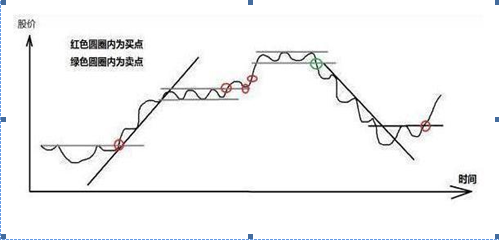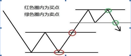 12、综合来看,正确的买卖选择如下图所示,红色点为正确的买点,绿色点为卖点或者减仓点,此图包含了个股从底部-拉升-顶部-下跌的四个过程。