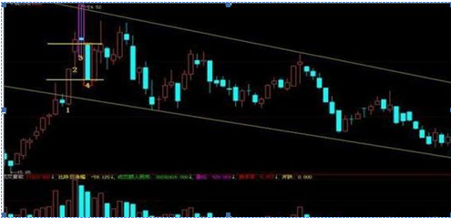 下图是该股的K线图,已经构成黄昏之星,我们把那周的几根K线分成1234四个编号,注意单从12两根K线我们继续认为该股处在超强区域,后市仍可看涨,但是随后第三根K线,收出了巨量十字线,这个K线振幅很大,多空分歧严重加大,并且上影线很长,已经有主力出货的嫌疑,那么此刻对后市不确定最好获利减仓,随后的第4根K线解释了一切,注意:第4根K线击穿了第2根K线的实体的一半以下,这是极端的出货信号,清仓不犹豫,虽然后面2天反复,但是不是短线高手最好不要参与,随后该股果然延续了漫长的下跌通道。