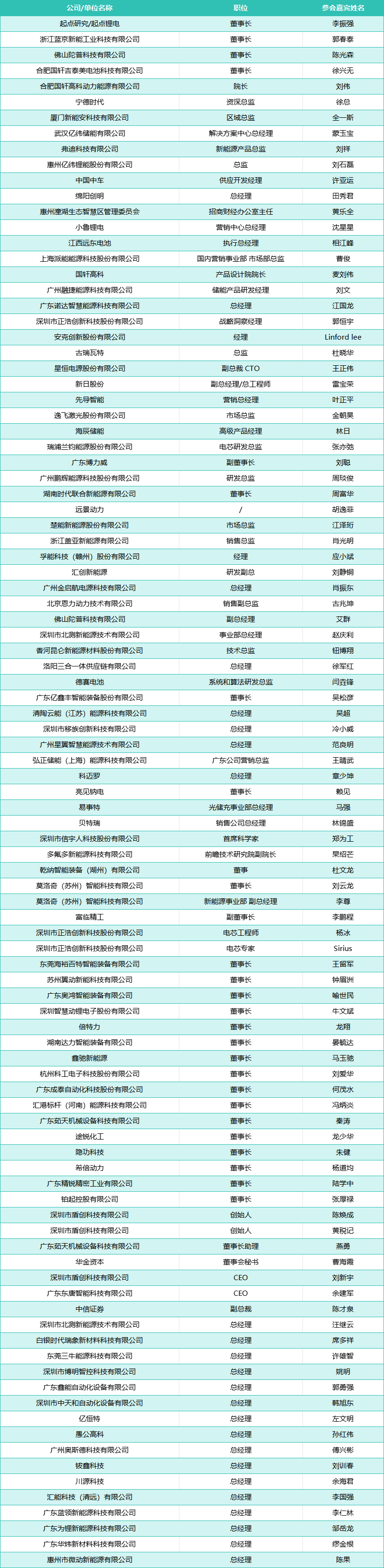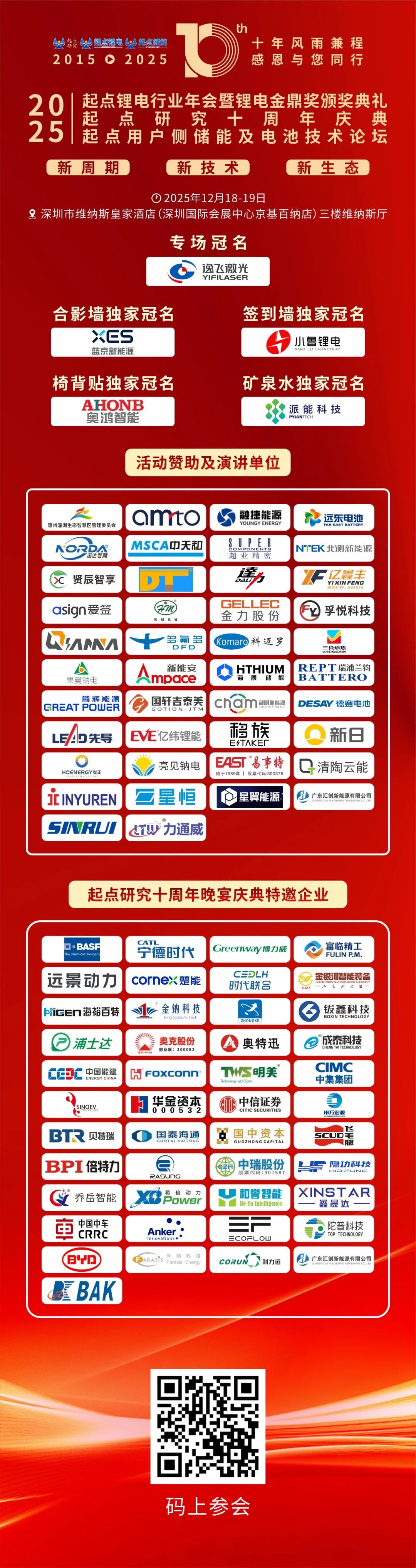 起点研究十周年晚宴庆典特邀企业名单(赞助及演讲单位以外):巴斯夫/宁德时代/博力威/富临精工/远景动力/楚能新能源/时代联合/金银河/海裕百特/金钠/中科云储/钹鑫科技/川马激光/浦士达/奥克股份/奥特迅/成泰科技/中能建/富士康储能/中集储能/星霆动力/新日股份/华金资本/中信证券/申万宏源/德旭资本/贝特瑞/国泰海通/国中资本/飞毛腿/倍特力/瑞昇新能源/中瑞股份/隐功科技/乔岳智能/希倍动力/和誉智能/中国中车/安克创新/正浩科技/陀普科技/比亚迪/孚能科技/科力远/比克电池等