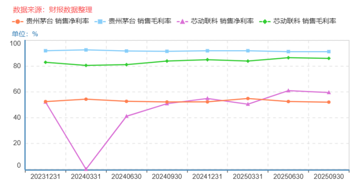 但是我们发现,芯动联科毛利率常年保持在85%左右的超高水平,并且净利率在2024年高达54.9%已经领先茅台,并且在2025年三季度净利率提高到了59.5%,还拉开了与茅台的距离。