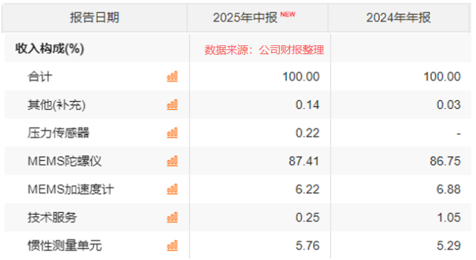 公司一直垂直深耕细分领域,那就是MEMS惯性传感器,核心产品就是MEMS陀螺仪和MEMS加速度计。从营收结构看,2025年半年报,公司MEMS陀螺仪营收占比高达87.41%,MEMS加速度计营收占比6.22%,可见专注程度。