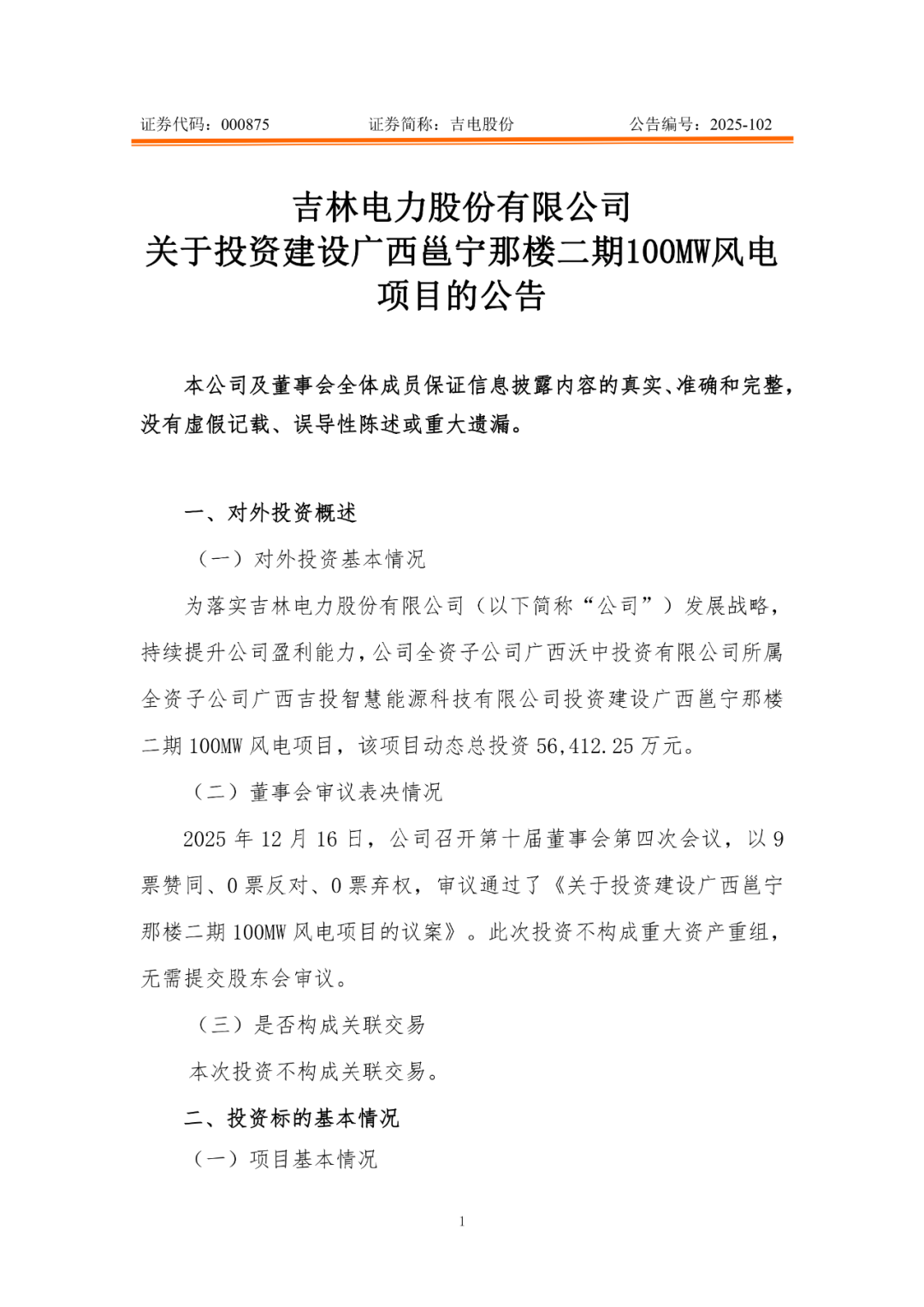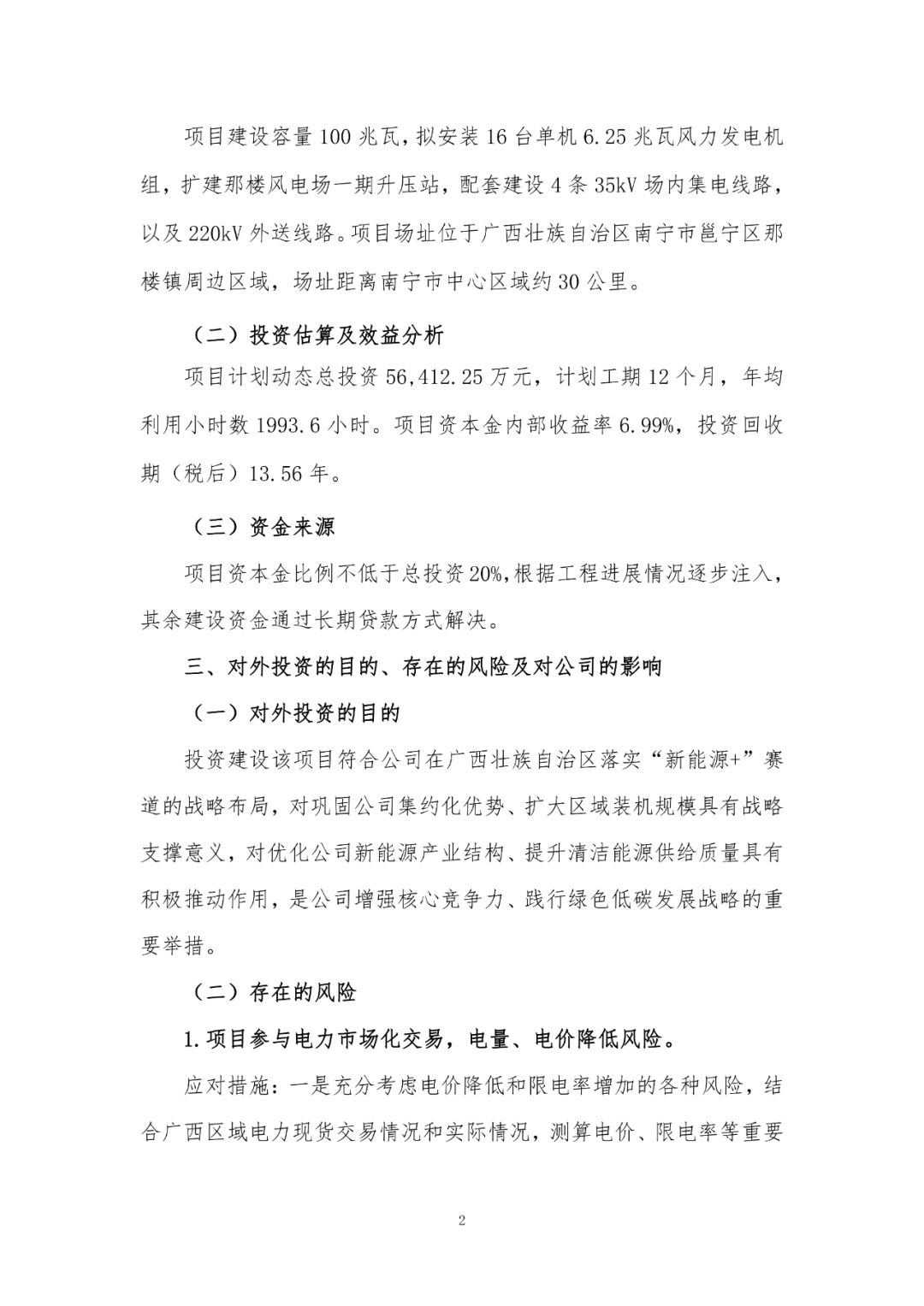 风芒能源获悉,12月17日,吉林电力股份有限公司(简称:吉电股份)发布《关于投资建设广西邕宁那楼二期100MW风电项目的公告》。