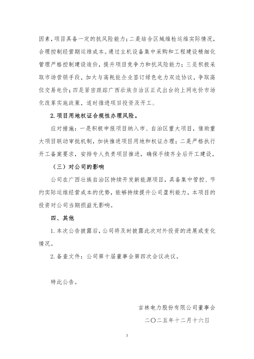 吉电股份表示,投资建设该项目符合公司在广西壮族自治区落实“新能源+”赛道的战略布局,对巩固公司集约化优势、扩大区域装机规模具有战略支撑意义,对优化公司新能源产业结构、提升清洁能源供给质量具有积极推动作用,是公司增强核心竞争力、践行绿色低碳发展战略的重要举措。