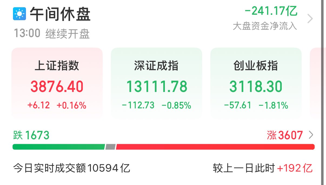 截至午盘,上证指数涨0.16%,深证成指跌0.85%,创业板指跌1.81%,北证50涨0.64%。全市场成交额10592亿元,较上日成交额放量190亿元。