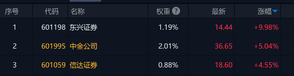今天东兴证券复牌一字板,中金公司、信达证券等也涨超4.5%以上。