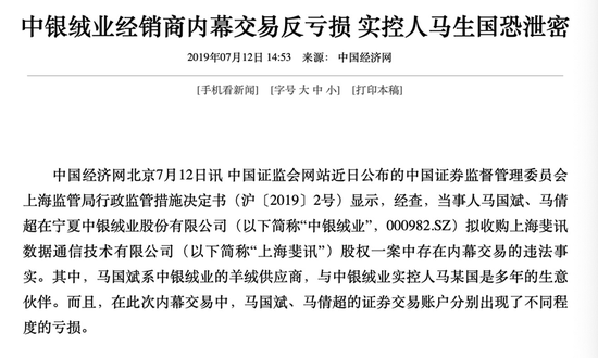 根据中国证监会上海监管局行政监管措施决定书(沪〔2019〕2号)显示,中绒集团曾在2016年6月尝试重组,11月14日至15日,松江区政府考察团赴银川与郭柏春、马生国等人会谈,明确支持重组。整个过程中,马生国作为中银绒业实控人,系内幕信息知情人。