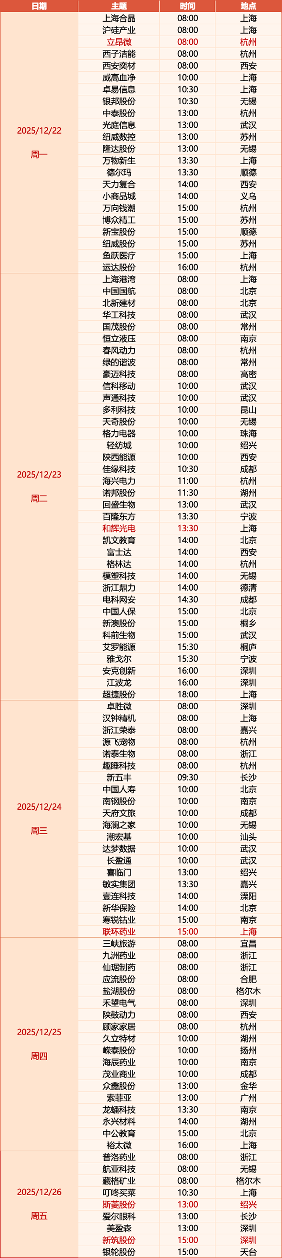 1、上海作为经济中心,调研热度居高不下,涵盖沪硅产业、上海合晶、万物新生、霍莱沃等10余家企业,涉及半导体、环保、消费服务等多个领域,董秘方总、IR负责人等核心高管均将参与交流。