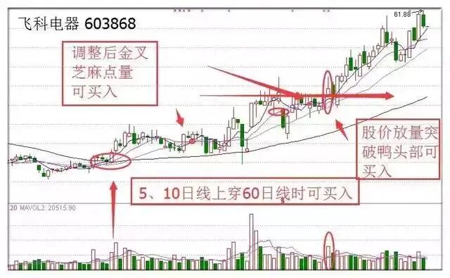 以个股飞科电器为例,5、10日线上穿60日均线,此时可买入。在鸭头部形成之前,还有一波小调整,调整后金叉的位置芝麻大点量处可买入,这里有两处买点,一处是前期的金叉处,另一处就是鸭鼻孔那里。鸭嘴张开后,股价放量突破,当股价放量突破前期鸭头位置时可以及时跟进,享受一波拉升。