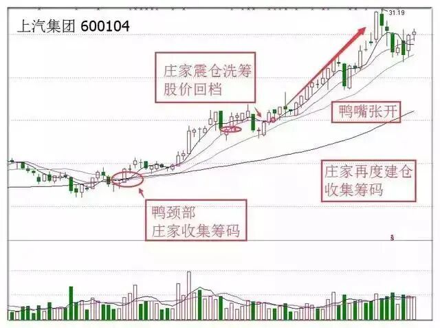 以个股上汽集团为例,5、10日线放量上穿60日线,鸭颈部庄家开始收集筹码,股价缓慢上升。鸭头部庄家震仓洗筹,股价略微回档。5、10日均线死叉再金叉,庄家再度建仓收集筹码,鸭嘴张开,股价迎来一波上涨。