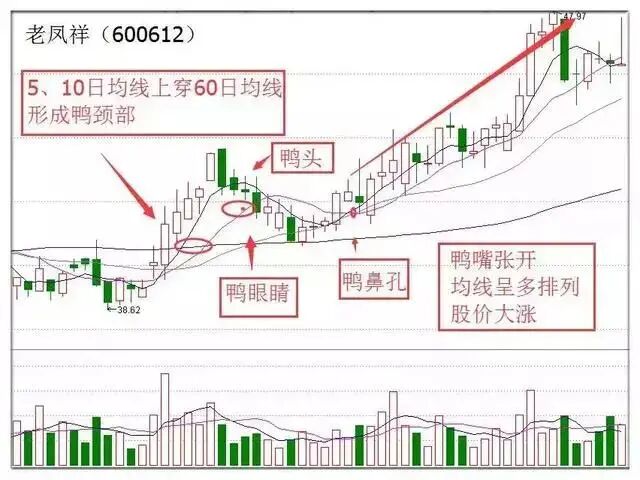 以个股老凤祥为例,5、10日线上穿60日线形成鸭颈部,股价多头排列阶段性上攻。高处形成鸭头后,股价回落,同时5日线和10日线死叉。随后5日线和10日线再次金叉形成鸭嘴,均线呈多头排列,股价大涨,开启一波主升浪。