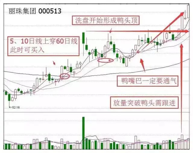 以个股丽珠集团为例,5、10日线上穿60日均线,此时可买入。随后庄家高位洗盘,形成鸭头顶。当5日和10日线再度金叉形成鸭鼻孔,附近成交量芝麻大点的位置可以逢低买入。鸭嘴张开后,股价放量突破,当股价突破前期鸭头位置时可以及时跟进。