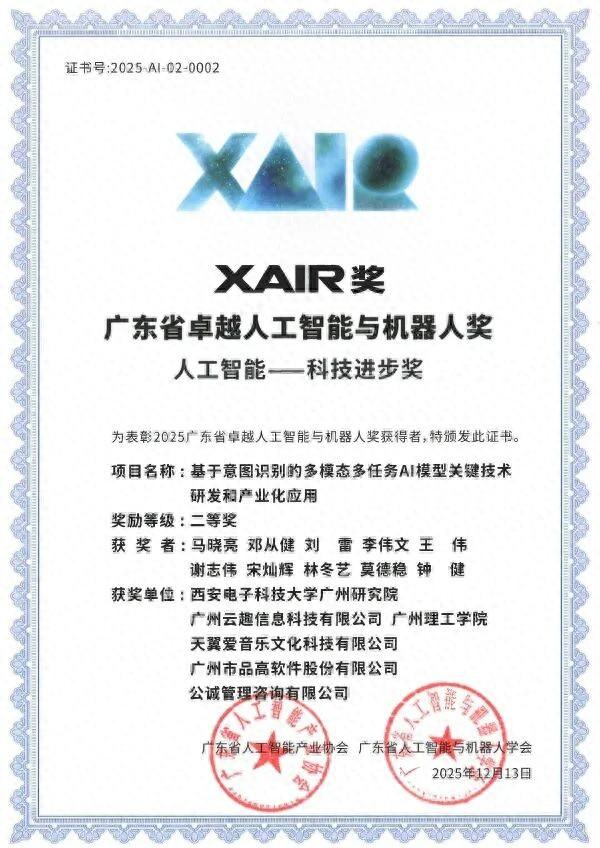 近日,2025年粤港澳大湾区人工智能与机器人产业大会暨广东省人工智能与机器人技能大赛圆满落幕。大会以“智联世界 湾区新篇”为主题,旨在搭建政产学研用商融合的高端平台,汇聚创新资源,推动技术突破与产业融合,为大湾区培育新质生产力、打造具有国际影响力的创新高地注入强劲动能。为表彰在人工智能与机器人领域取得突出贡献的项目,进一步指引产业发展路径,大会期间举行了“2025年度广东省卓越人工智能与机器人奖(XAIR奖)”颁奖典礼。评审工作由毛军发院士担任主席,汇集了ACM图灵奖得主John Hopcroft教授、陈国良院士等全球顶尖专家。经过激烈角逐,由⼴州市品⾼软件股份有限公司联合西安电⼦科技⼤学⼴州研究院、⼴州云趣信息科技有限公司、⼴州理⼯学院、天翼爱⾳乐⽂化科技有限公司、公诚管理咨询有限公司等单位共同申报的《基于意图识别的多模态多任务AI模型关键技术研发和产业化应⽤》项目荣获2025年度XAIR奖“人工智能——科技进步奖”二等奖。