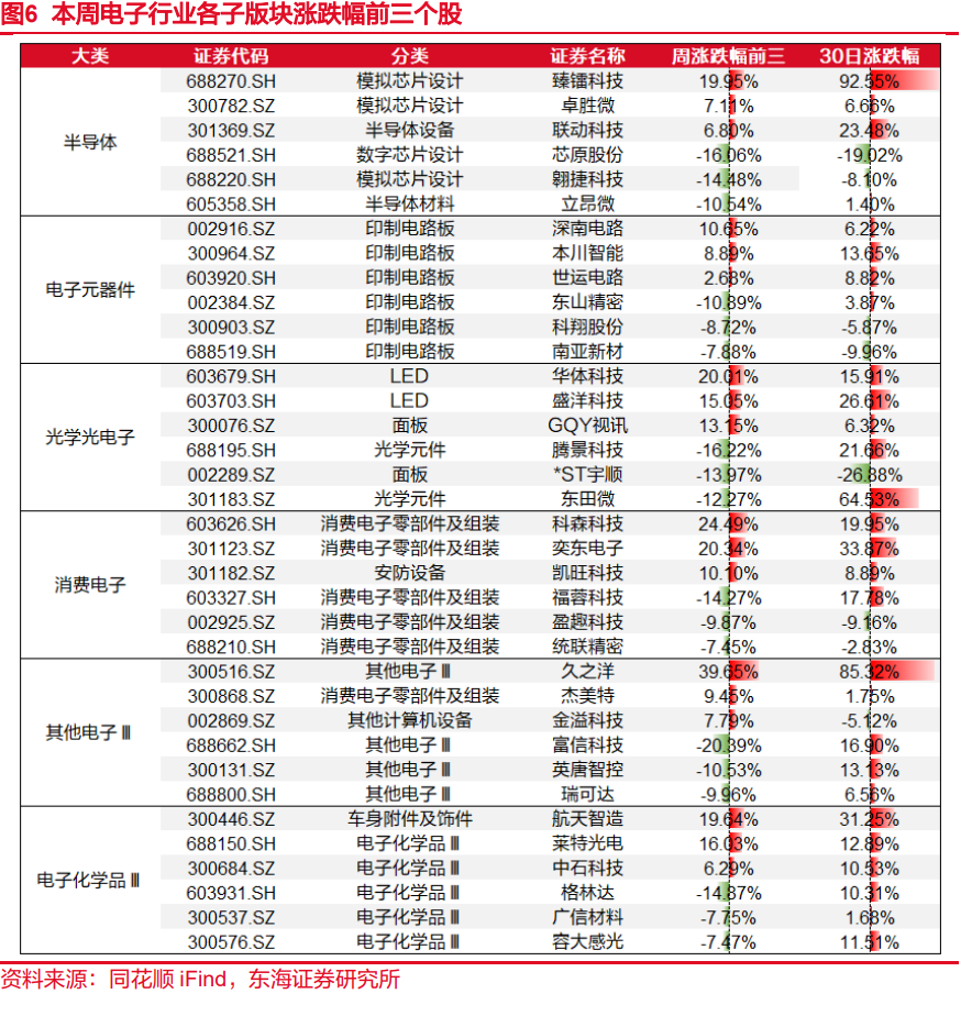 本周半导体细分板块涨跌幅分别为:品牌消费电子(+1.48%)、面板(-0.41%)、LED(-1.57%)、模拟芯片设计(-2.09%)、电子化学品Ⅲ(-2.31%)、半导体设备 (-2.68%)、集成电路封测(-2.78%)、光学元件(-2.92%)、分立器件(-3.24%)、被动元件(-3.33%)、印制电路板(-3.71%)、消费电子零部件及组装(-3.94%)、半导体材料(-4.10%)、数字芯片设计(-4.40%)、其他电子Ⅲ(-4.63%)。