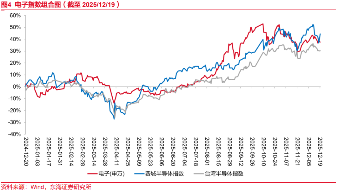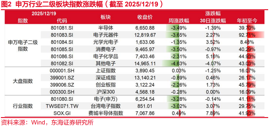 截止12月19日,申万电子二级子板块涨跌:半导体(-3.49%)、电子元器件(-3.65%)、光学光电子(-1.35%)、消费电子(-3.50%)、电子化学品(-2.31%)、其他电子(-4.63%)。海外方面,台湾电子指数下跌3.02%,费城半导体指数上涨0.49%。