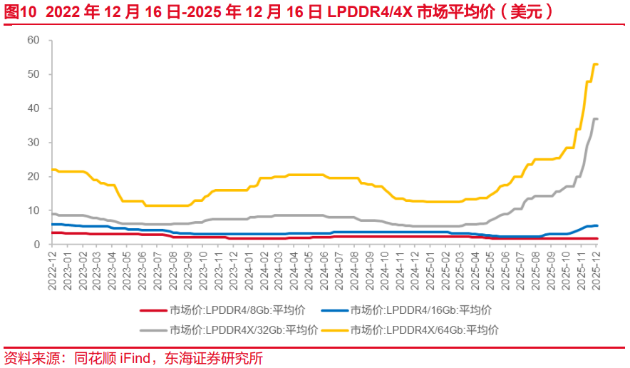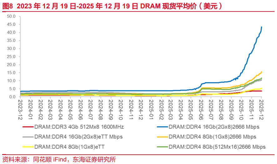 (1)存储芯片价格自2023年下半年以来小幅度反弹,但自2024年9月起,DRAM现货价格略有承压,部分DRAM细分产品价格自2025年2月中旬开始有所回升,波动上涨至6月,其中6月整体涨幅较大,DDR4价格已升至2022年的前期高点,7月起价格顶部震荡,9月起价格持续上涨,目前已延续至12月。NAND Flash合约价格在大幅下滑后于2025年1月回升,涨势已延续至10月。