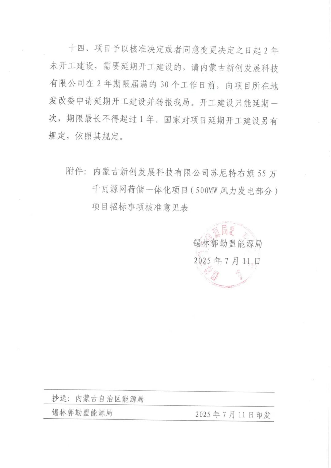 内蒙古新创发展科技有限公司苏尼特右旗55万千瓦源网荷储一体化项目(500MW风力发电部分)位于内蒙古自治区锡林郭勒盟苏尼特右旗赛汉塔拉镇巴润宝拉格嘎查境内,项目投资主体为新创智汇能源科技(内蒙古)有限公司,风电项目建设规模为500MW,拟选用单机容量10MW风力发电机组50台,配套数量箱变,集电线路、场内外道路及检修道路等,新建1座220kV升压站,并在负荷场地新建一座220kV变电站。项目总投资为155215.06万元。