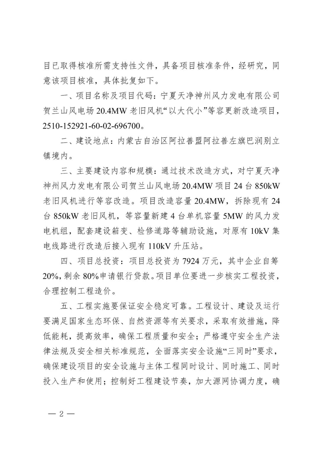 宁夏天净神州风力发电有限公司贺兰山风电场20.4MW老旧风机“以大代小”等容更新改造项目位于内蒙古自治区阿拉善盟阿拉善左旗巴润别立镇境内,项目单位为宁夏天净神州风力发电有限公司,通过技术改造方式,对宁夏天净神州风力发电有限公司贺兰山风电场20.4MW项目24台850kW老旧风机进行等容改造。项目改造容量20.4MW,拆除现有24台850kW老旧风机,等容量新建4台单机容量5MW的风力发电机组,配套建设箱变、检修道路等辅助设施,对原有10kV集电线路进行改造后接入现有110kV升压站。项目总投资为7924万元。