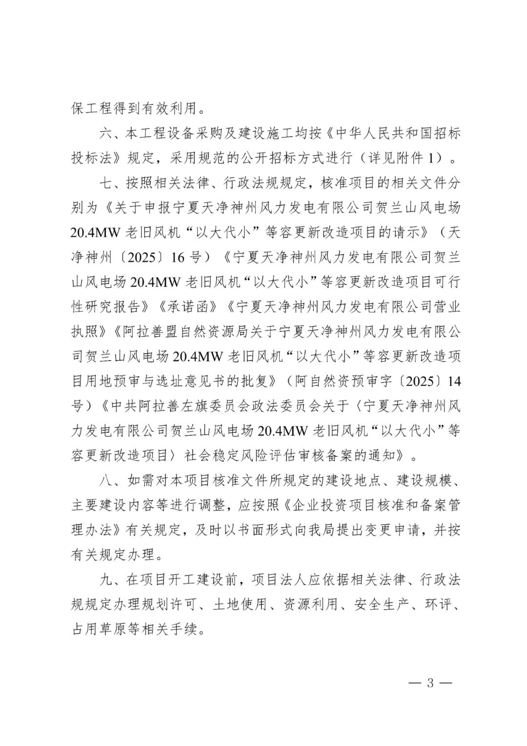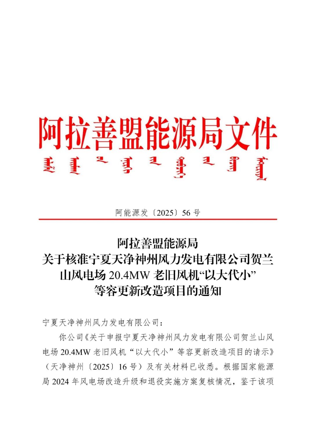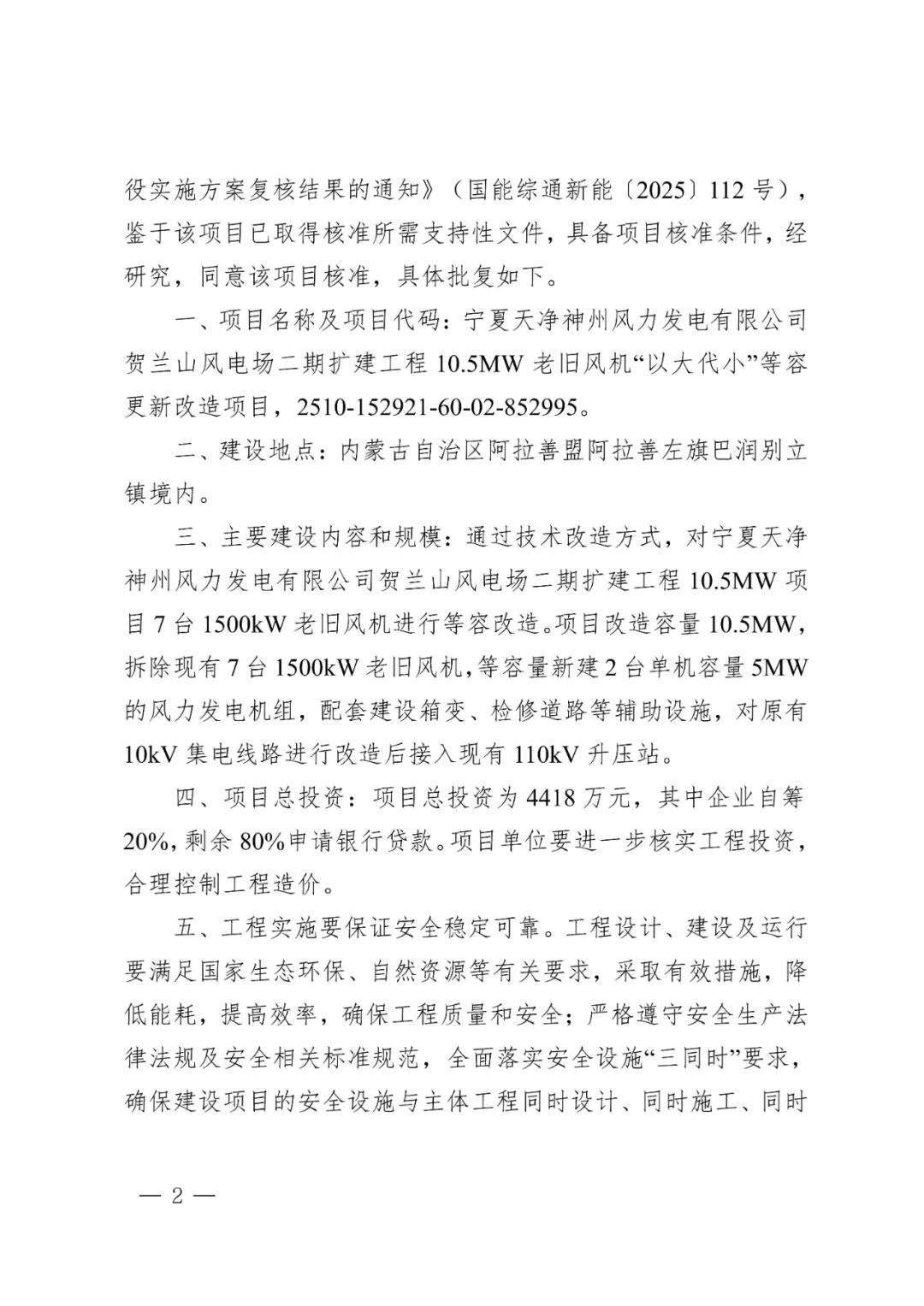 宁夏天净神州风力发电有限公司贺兰山风电场二期扩建工程10.5MW老旧风机“以大代小”等容更新改造项目位于内蒙古自治区阿拉善盟阿拉善左旗巴润别立镇境内,项目单位为宁夏天净神州风力发电有限公司,通过技术改造方式,对宁夏天净神州风力发电有限公司贺兰山风电场二期扩建工程10.5MW项目7台1500kW老旧风机进行等容改造。项目改造容量10.5MW,拆除现有7台1500kW老旧风机,等容量新建2台单机容量5MW的风力发电机组,配套建设箱变、检修道路等辅助设施,对原有10kV集电线路进行改造后接入现有110kV升压站。项目总投资为4418万元。