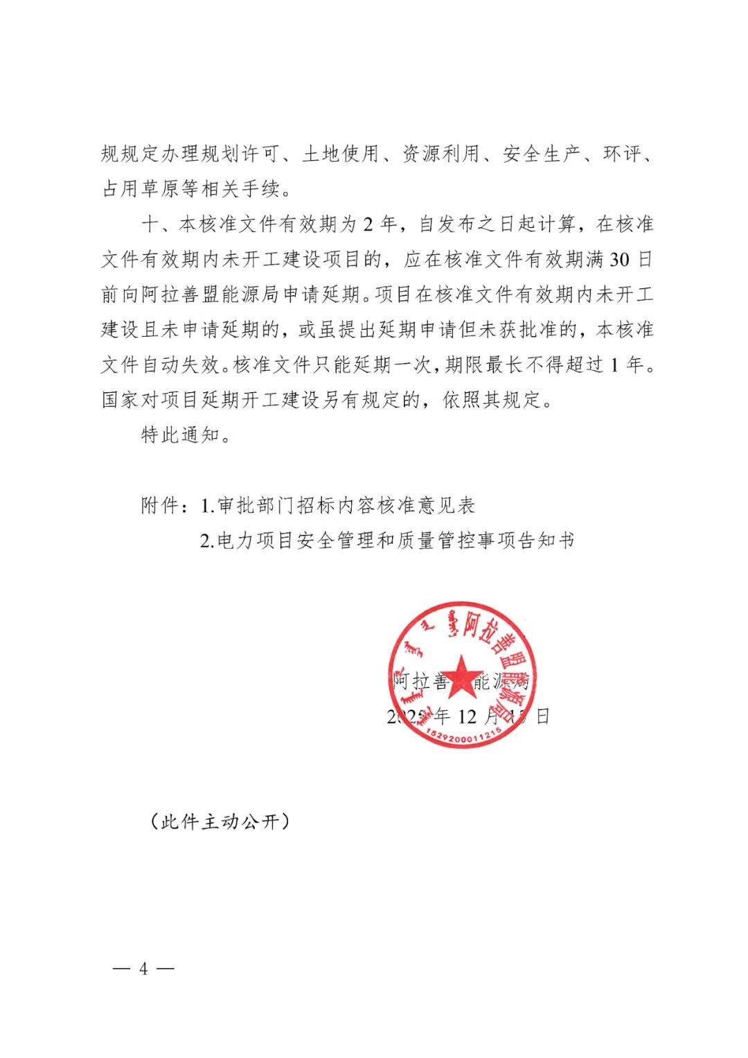 中盐吉兰泰氯碱化工有限公司燃煤自备电厂可再生能源替代项目(75MW风电工程)建设地点为阿拉善高新技术产业开发区境内,建设单位为中盐吉兰泰氯碱化工有限公司,同意将项目核准文件建设内容变更为:本项目拟建设8台8.5MW风电机组及1台7.15MW风电机组,总装机容量75MW,新建220kV升压站一座,配套建设风机箱变、16.2MW/32.4MWh储能、集电线路杆塔及检修道路等辅助设施。