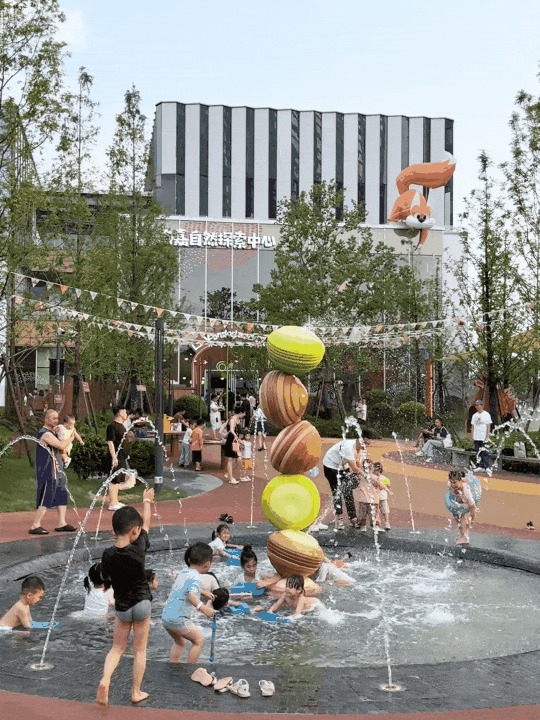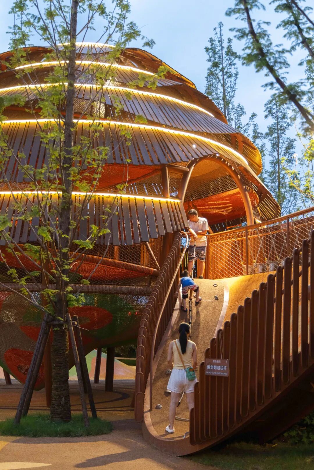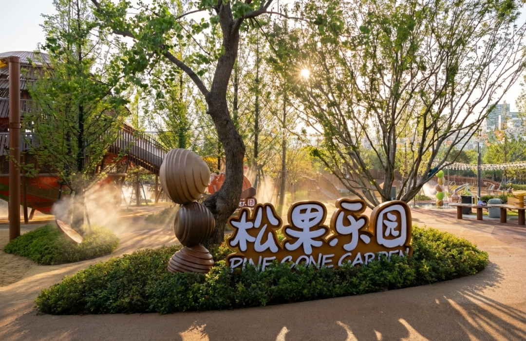 色彩上,项目模仿大地、树木、果实的自然色系(如土壤棕、树叶绿、野果红)替代了原先高饱和的蓝色和黄色,同时增加更多绿植树木,让乐园视觉沉稳地“生长”于环境之中。