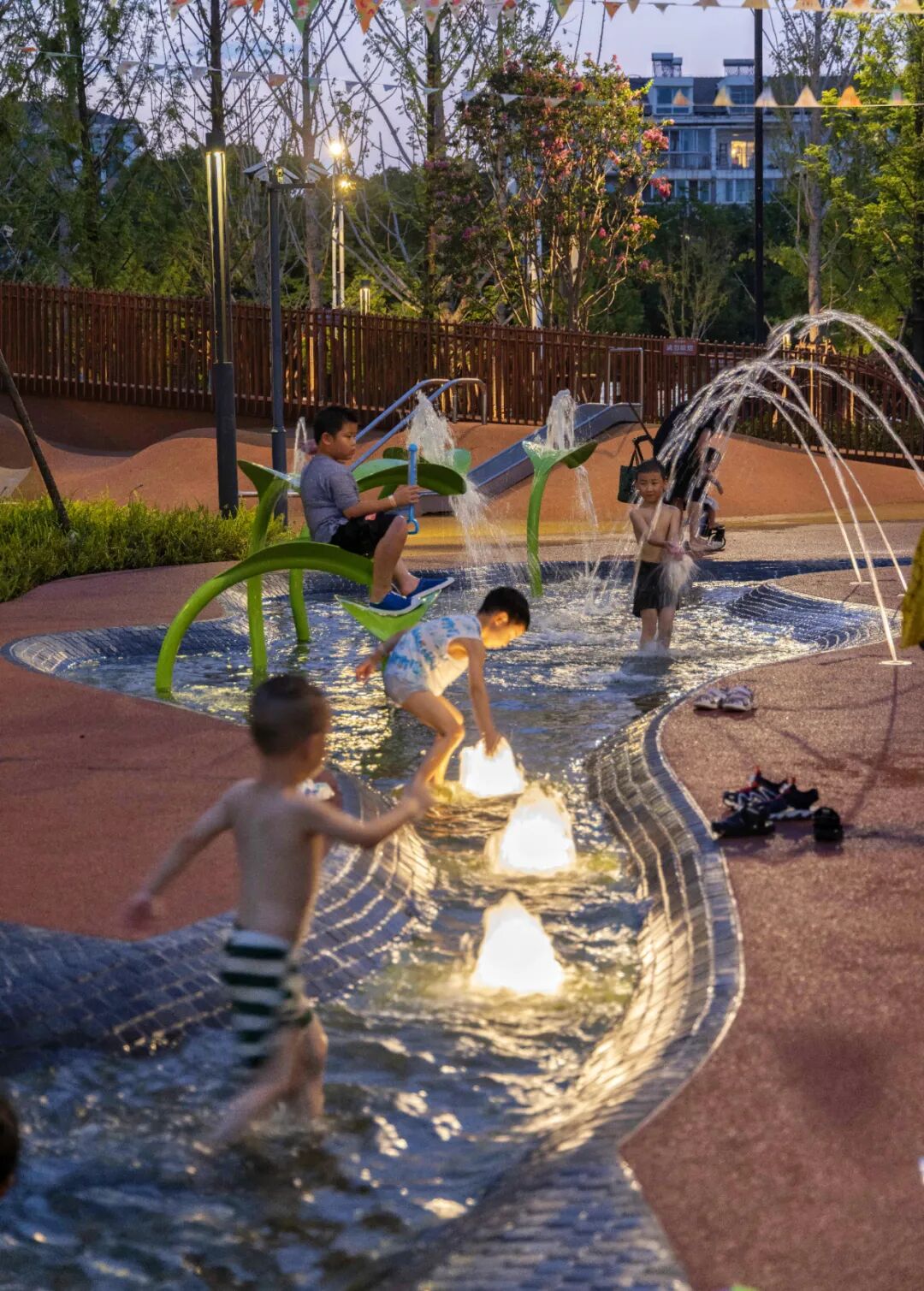 踏入趣野森林,原本陡峭高耸的艺术地形化作绵延舒展的舒缓草坡,温柔消解了原本地形的凌厉感。蜿蜒的曲线园路缀以置石、植物花镜和小水景,既划分了活动边界,又保留了原生野趣,创造出更丰富的景观层次。