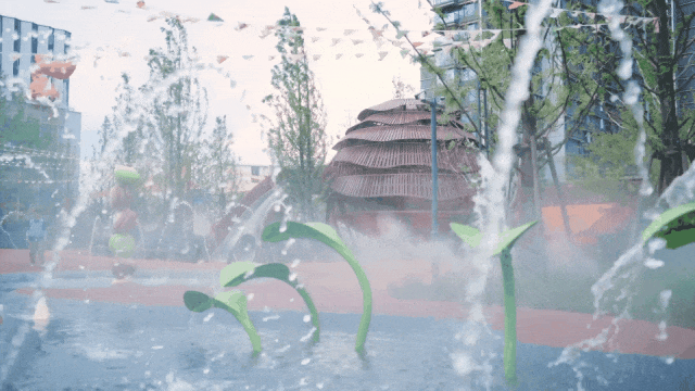 穿过溪谷,水流渐趋平缓,薄雾如轻纱般在周围弥漫。错落有致的叶片上,水流顺势而下,几枚巨型青冈果堆叠而成的高塔暗藏惊喜——不经意间便会喷出水柱,为这份静谧增添了灵动的互动感。