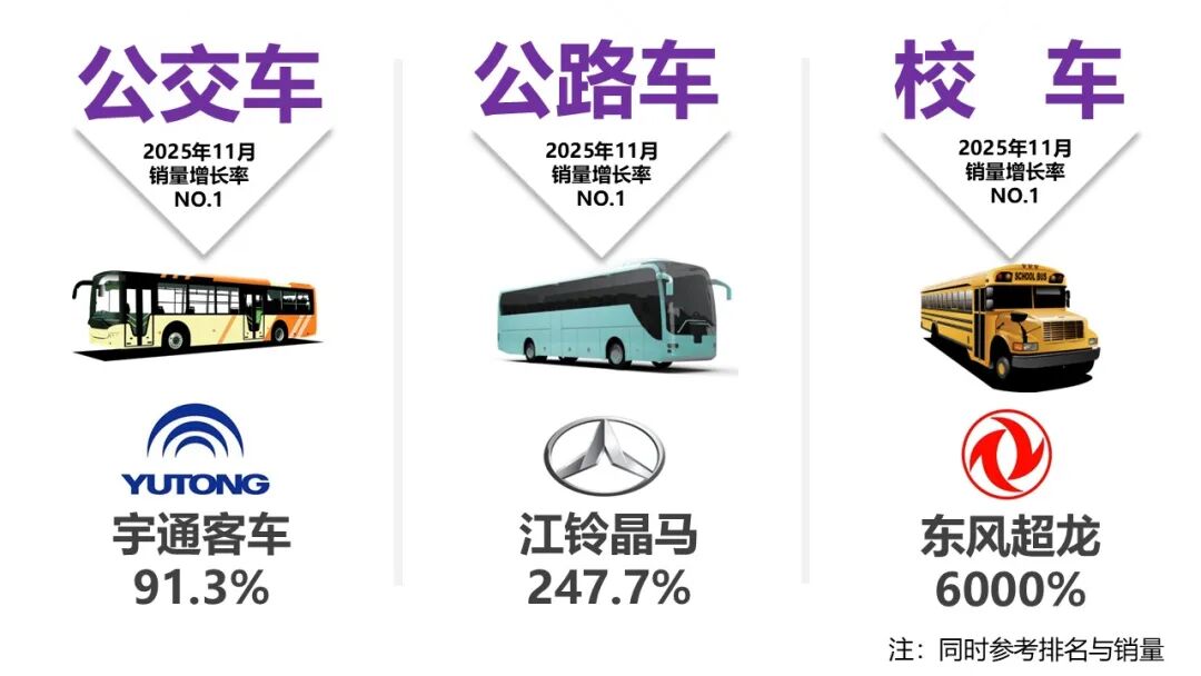 2025年11月份共实现销售13954辆,同比增长10.8%,其中公交车实现销售8283辆,占比59.4%,同比增长14.4%。公路客车实现销售5527辆,占比39.6%,同比增长4.3%。校车实现销售144辆,占比1.0%,同比增长148.3%。1-11月累计销售121187辆,其中公交车共实现销售56210辆,占比46.4%,同比增长26.0%。公路车实现销售62722辆,占比51.8%,同比下滑7.9%。校车实现销售2255辆,占比1.9%,同比下滑3.4%。