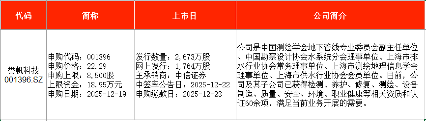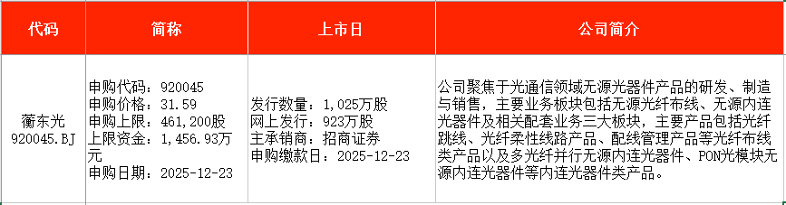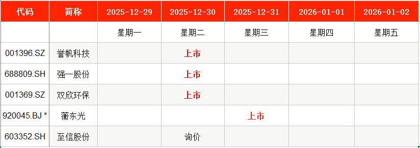 从时间表看,誉帆科技(001396)、强一股份(688809)、双欣环保(001369)等均将在本周二(12月30日)上市;蘅东光(920045)将在本周三(12月31日)上市。